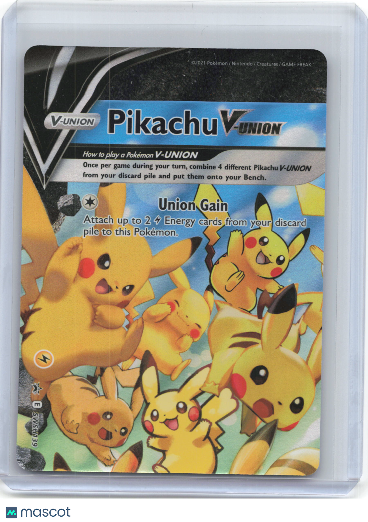Please read the title of the listing while confirming the photo(s) and the description below. Use the photos as reference as the card condition listed may be incorrect. Please note that for card singles, minor image warping may be present due to our scanning process, but if a misprint is present on the card, the listing will declare so. Reach out to us in advance if you have any questions about condition or quality! Items are crossposted and synced across multiple platforms so act soon if interested! Item Information Character: Pikachu V-Union Card Number: #SWSH139 Year: 2021 Game: Pokemon Set: Sword & Shield Promo Cards Rarity: Black Star Promo Finish: Foil Features: Condition: Near Mint or Better Grade (if applicaple): You are purchasing a 2021 Pokemon—Pikachu V-Union #SWSH139 Sword & Shield Promo Cards—Black Star Promo Foil. You will receive the exact item in the photographs. Thank you for shopping with us! Listed With Mascot.