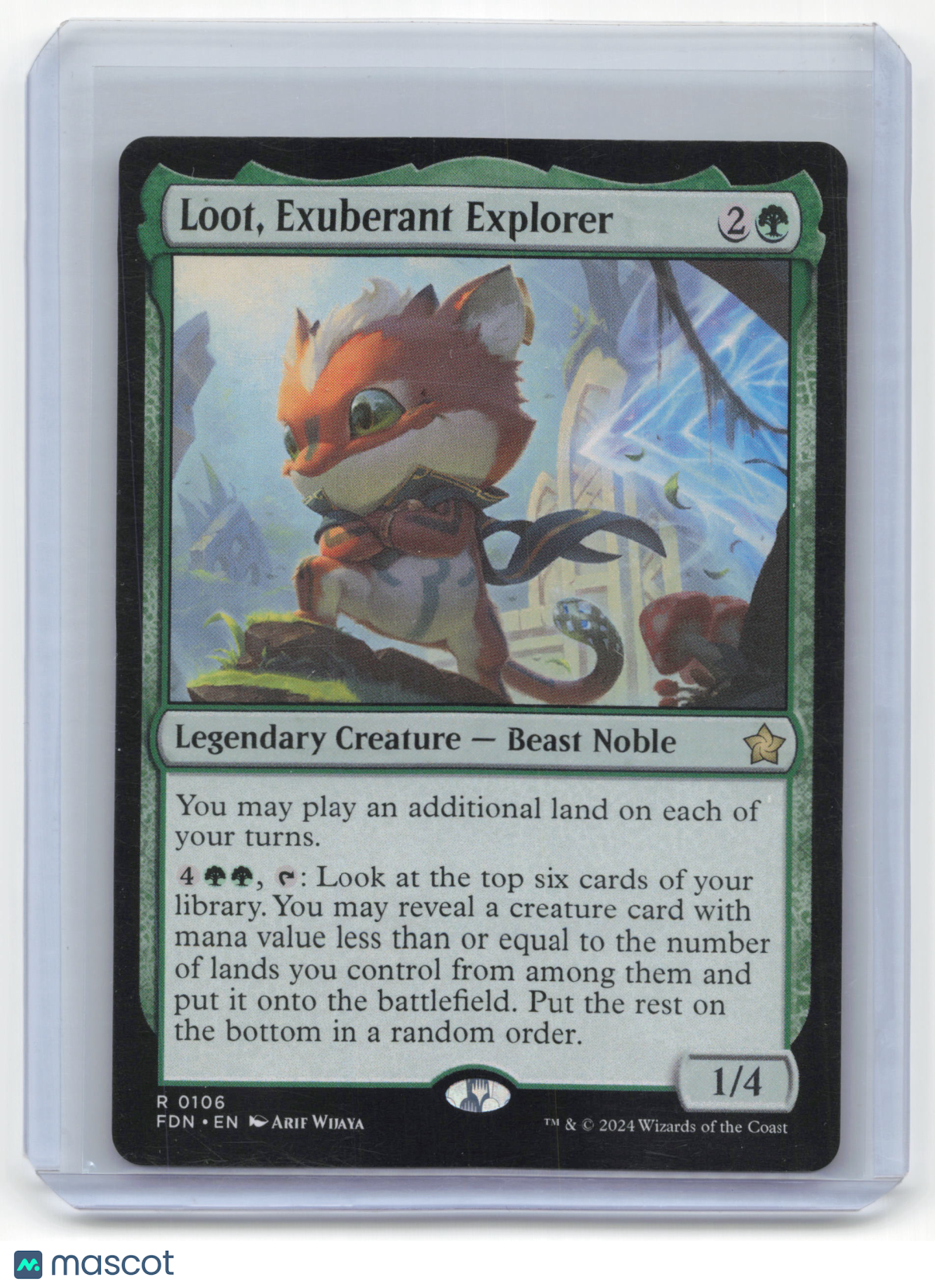 Please read the title of the listing while confirming the photo(s) and the description below. Use the photos as reference as the card condition listed may be incorrect. Please note that for card singles, minor image warping may be present due to our scanning process, but if a misprint is present on the card, the listing will declare so. Reach out to us in advance if you have any questions about condition or quality! Items are crossposted and synced across multiple platforms so act soon if interested! Item Information Character: Loot, Exuberant Explorer Card Number: #106 Year: 2024 Game: Magic: The Gathering Set: Foundations Rarity: Rare Finish: Non-Foil Features: Condition: Near Mint or Better Grade (if applicaple): You are purchasing a 2024 Magic: The Gathering Loot, Exuberant Explorer Foundations Rare Non-Foil #106. You will receive the exact item in the photographs. Thank you for shopping with us! Listed With Mascot.