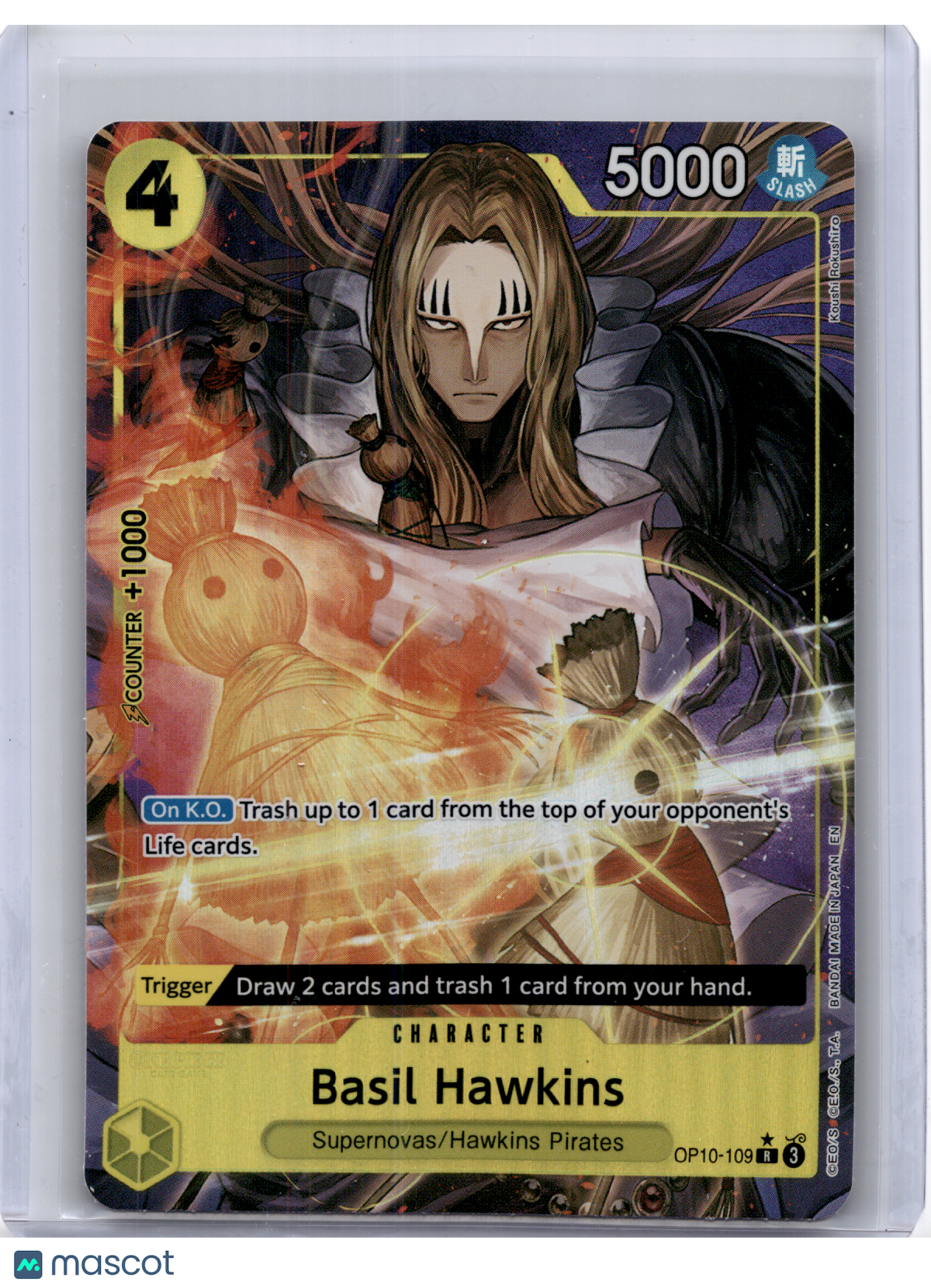 Please read the title of the listing while confirming the photo(s) and the description below. Use the photos as reference as the card condition listed may be incorrect. Please note that for card singles, minor image warping may be present due to our scanning process, but if a misprint is present on the card, the listing will declare so. Reach out to us in advance if you have any questions about condition or quality! Items are crossposted and synced across multiple platforms so act soon if interested! Item Information Character: Basil Hawkins Card Number: #OP10-109 Year: 2025 Game: One Piece Set: The Best Vol. 2 (Premium) Rarity: Rare Finish: Foil Features: Alt Art Condition: Near Mint or Better Grade (if applicaple): You are purchasing a 2025 One Piece—Basil Hawkins #OP10-109 The Best Vol. 2 (Premium)—Rare Foil Alt Art. You will receive the exact item in the photographs. Thank you for shopping with us! Listed With Mascot.