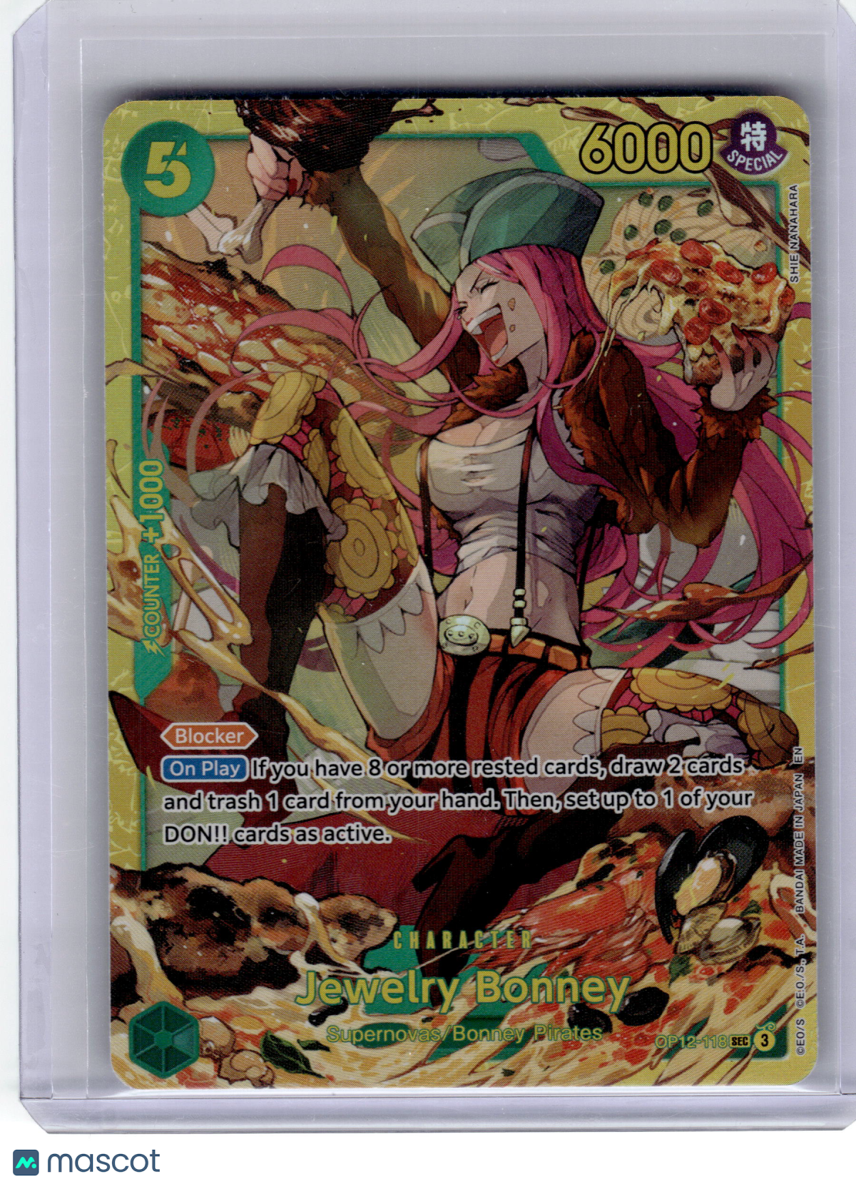 Please read the title of the listing while confirming the photo(s) and the description below. Use the photos as reference as the card condition listed may be incorrect. Please note that for card singles, minor image warping may be present due to our scanning process, but if a misprint is present on the card, the listing will declare so. Reach out to us in advance if you have any questions about condition or quality! Items are crossposted and synced across multiple platforms so act soon if interested! Item Information Character: Jewelry Bonney Card Number: #OP12-118 Year: 2025 Game: One Piece Set: Legacy of the Master Rarity: Secret Rare Finish: Foil Features: Condition: Near Mint or Better Grade (if applicaple): You are purchasing a 2025 One Piece—Jewelry Bonney #OP12-118 Legacy of the Master—Secret Rare Foil. You will receive the exact item in the photographs. Thank you for shopping with us! Listed With Mascot.