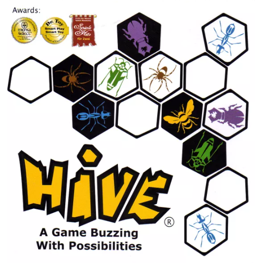 Hive is a strategic game for two players that is not restricted by a board and can be played anywhere on any flat surface. Hive is made up of twenty two pieces, eleven black and eleven white, resembling a variety of creatures each with a unique way of moving.