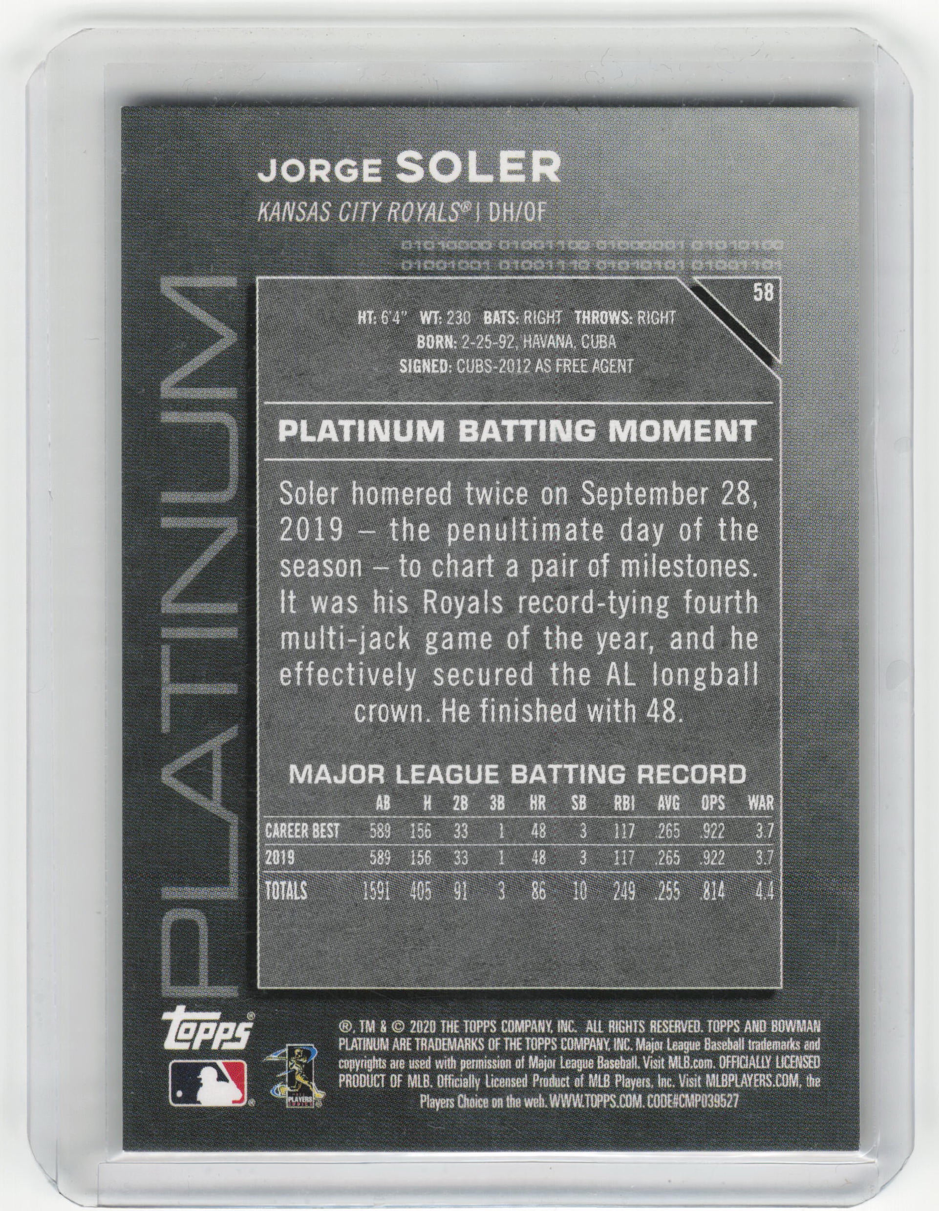 Topps 2020 Bowman Platinum Baseball Jorge Soler 25/25 Gold #58 Near Mint